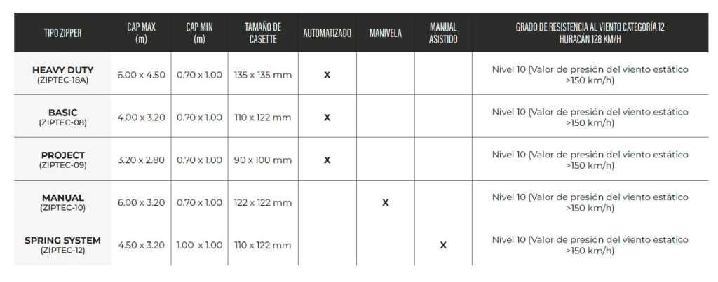 Gracias a sus accesorios de aluminio y telas técnicas, el Zipper Screen ofrece alta resistencia al viento, al polvo y a los insectos, siendo ideal para exteriores.